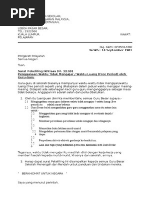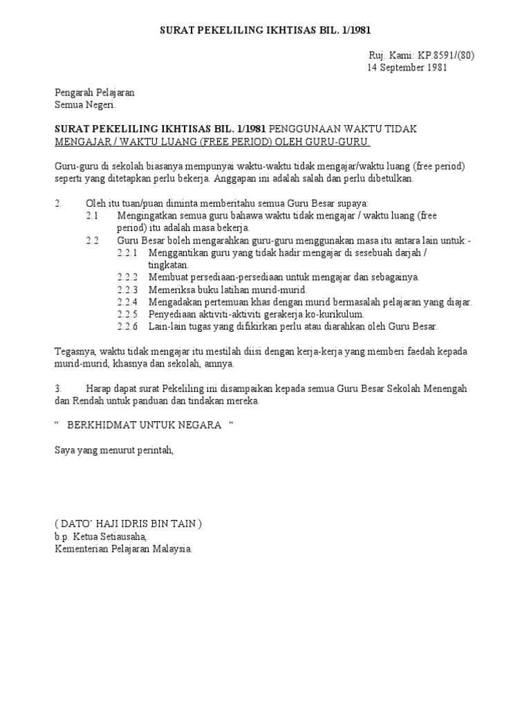 Embed Surat Pekeliling Ikhtisas Bil 3 1981 Penggunaan Waktu Tidak Mengajar to websites for free. SURAT PEKELILING IKHTISAS BIL. Inilah bunyi ayat pertama dalam Pekeliling Ikhtisan Bil 21981.