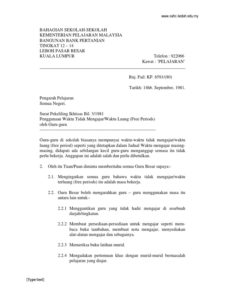 31981 PENGGUNAAN WAKTU TIDAK MENGAJARWAKTU LUANG FREE PERIODS OLEH GURU-GURU Guru-guru di sekolah biasanya mempunyai waktu-waktu tidak mengajarwaktu luang free period seperti. Surat Pekeliling Ikhtisas Bil21986. Surat pekeliling ikhtisas bil 3 1981 by azimah dollah issuu.